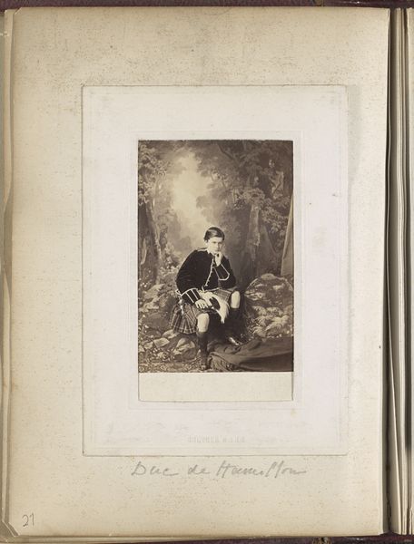Curator: This gelatin silver print by William Notman, dating from 1866, is titled "Jagers om een geschoten eland," or "Hunters around a shot elk." What are your initial thoughts? Editor: A striking stillness pervades the image, even with the elk laid out on the ground. The sepia tones create an air of almost theatrical formality around this kill; what story does it tell about this period and those pictured? Curator: I'm fascinated by the way Notman uses the tradition of history painting in photography here. Note the careful posing and arrangement, akin to classical hunting scenes elevated to grand narratives. But whose story is really being told and who benefits here from the glorification of the 'hunt'? Editor: It seems deliberate, this echoing of painterly conventions within a relatively new medium. And perhaps the history being written is one of masculine prowess and dominion over nature, reinforced by class and racial dynamics—the relationship between guides and officers implied on the page. Is it intended to shape societal perspectives about land management? Curator: Exactly. It visualizes a complex set of power relations. Notman was commercially astute, producing these images for a burgeoning tourist market eager to consume a romanticized version of the Canadian wilderness. The staged nature points to the constructed identity around this wilderness adventure as well as those participating in these outings, especially with the onset of increased resource extraction. Editor: Knowing this was made for the tourist trade adds a crucial layer. The staged "naturalness" underscores how colonial expansion was actively marketed and consumed. The focus is removed from ecological perspectives and shifted to personal accomplishment. It all emphasizes an evolving sense of what wilderness represented during Canadian expansion. Curator: Indeed, these meticulously composed scenes were integral to how the Canadian landscape became perceived both domestically and abroad, solidifying its appeal to wealthy sportsmen but to what consequence for indigenous ways of living and more respectful approaches? Editor: It’s sobering to think how images like this were actively involved in scripting and solidifying problematic narratives. The very act of staging such photographs speaks volumes, even across a century.