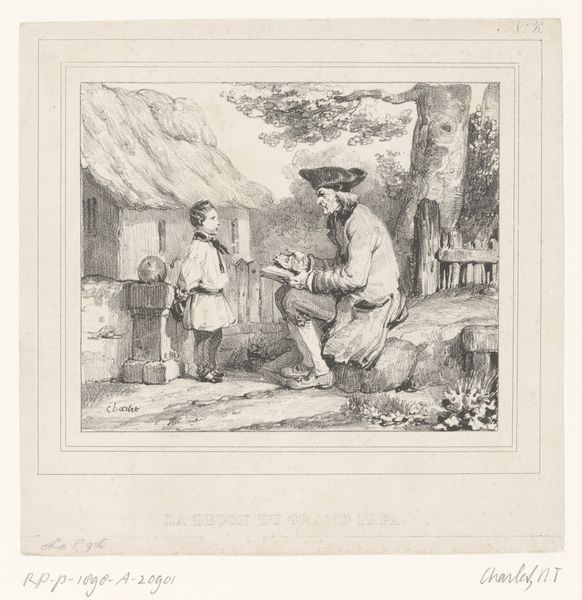 "Biddende man aan tafel," or "Praying Man at the Table," is a small etching by Ferdinand de Braekeleer, created sometime in the 19th century. In this intimate scene, we see a man bowed in prayer at his modest table, a dog faithfully by his side, with a crucifix hung on the wall. Consider the historical context of 19th-century Belgium. The echoes of religious and political upheaval undoubtedly influenced the artist's choice to depict such a humble, pious scene. What does it mean to represent a man in such quiet devotion? Is it an idealized vision of masculinity, contrasting with the era's industrialization and societal changes? De Braekeleer invites us to reflect on the intersection of faith, simplicity, and domesticity. The image evokes a sense of personal reflection and the quiet dignity of everyday faith. It asks us to consider how our own beliefs shape our identities and our place in the world.