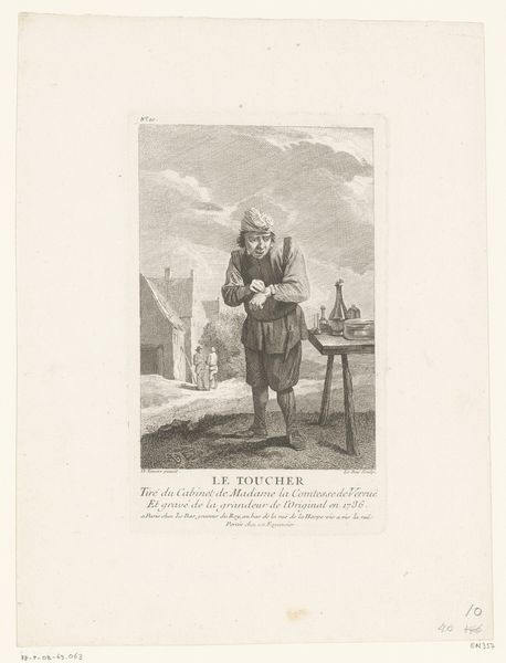 Jacques Philippe Le Bas created this print called 'Gehoor', or 'Hearing', after an original artwork from 1736. The print itself was made in 1786. Here, Le Bas creates a visual representation of sound. The central figure, a wandering musician with a hurdy-gurdy, embodies the act of listening through the sounds he creates. This image was part of a series owned by Madame la Comtesse de Verruë, highlighting the taste and collecting habits of the aristocracy. The social and economic structures of 18th-century France are deeply embedded in this print. The image reflects the cultural value placed on the senses, particularly in aristocratic circles, and the role of art as a status symbol. The choice of a traveling musician also hints at the broader social landscape. Understanding this artwork requires us to consider not just its visual elements but also its place within the social and institutional contexts of its time. Researching the collecting habits of the aristocracy and the role of printmaking in disseminating images can offer deeper insights into its meaning.