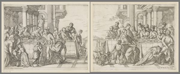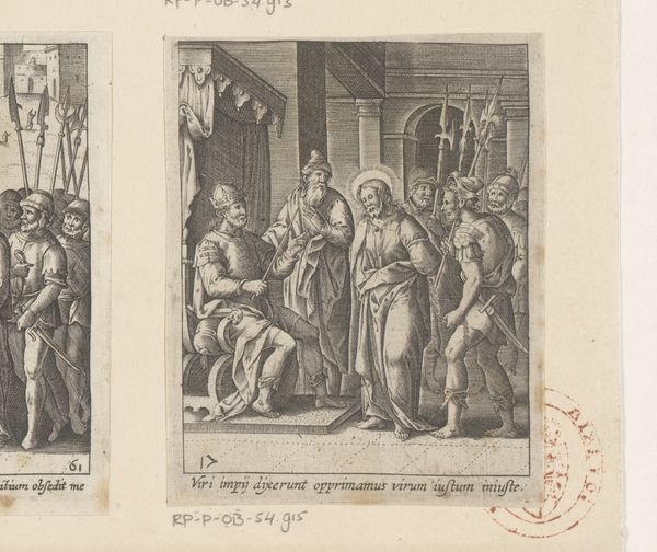 Editor: So, here we have "Pilatus wast zijn handen in onschuld," an engraving from between 1582 and 1671, housed at the Rijksmuseum. Looking at it, the detail is really striking for a print. There's this real sense of drama, particularly in Pilate's gesture. What stands out to you in this piece? Curator: The act of washing hands itself is loaded with meaning. It's more than just a physical action; it's a theatrical display, a symbolic attempt to cleanse oneself of responsibility, in this case, the condemnation of Christ. Consider how this image resonates through centuries – how often do we see the "washing of hands" used metaphorically to describe leaders avoiding accountability? Editor: That's a good point. So you're saying the artist uses this very specific moment to communicate a broader message about responsibility? Curator: Exactly. Think about the visual language – Pilate is seated above, almost detached, while Christ is presented as vulnerable, innocent. The surrounding figures, the architectural elements… they all contribute to the story, layering the symbolism. The composition reinforces the core theme: the powerful washing away their guilt. The scene next to it, carrying the cross, illustrates his fate despite Pilate's performance. What impact does that contrast have? Editor: I guess it shows the futility of Pilate's act. The scene is already in motion; he can’t stop what’s about to happen no matter what gesture he performs. It’s really quite powerful, almost like a visual indictment of inaction disguised as action. Curator: Precisely. These enduring symbols speak volumes about human nature, the complexities of power, and the burdens of innocence throughout history. The piece is an astute commentary on how cultures remember events, encode their judgments in art, and how relevant those images remain. Editor: It’s amazing how much can be packed into a single image when you start to unpack the layers of symbolism. Thanks for your insights! Curator: My pleasure. I am struck by how much a relatively simple symbolic gesture can reverberate across so many centuries, carried forward through imagery.