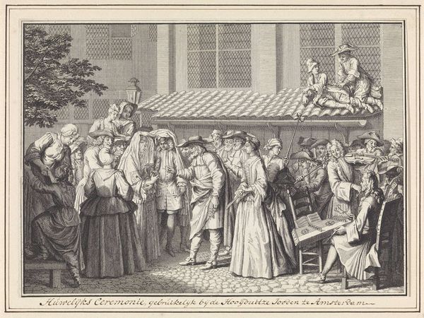 Editor: We’re looking at a print here in the Rijksmuseum titled "Voetwassing op Witte Donderdag en de aanbidding van het kruis op Goede Vrijdag," or "The Washing of Feet on Maundy Thursday and the Adoration of the Cross on Good Friday," created in 1724 by Bernard Picart. It's an engraving, and what immediately strikes me is the composition. It’s divided into two distinct scenes. How would you interpret this structuring of the imagery? Art Historian: The division certainly dictates our initial reading. Consider first the upper register. Notice how Picart orchestrates the figures; their gestures, directed glances, and implied movement collectively invite the eye to traverse the space. This creates a balanced and visually rhythmic experience. Note the expert use of hatching and cross-hatching to suggest form and texture. Does this linearity add or detract from the emotive potential? Editor: I see what you mean about the gestures guiding the eye. But with only monochrome to work with, wouldn’t it seem a limitation that it may restrict emotion by not being able to leverage warmer colors? Art Historian: Restraint can be expressive, if it emphasizes lines over shading. Are you observing here a baroque sensibility through its line quality, or could this work speak outside its artistic period? Note how the artist manages to suggest weight and volume despite a restricted palette. We can observe an elaborate and theatrical narrative with an attention to decorative details. What’s your take on the composition’s two part harmony of themes and scenes? Editor: Well, seeing them side-by-side really heightens the contrast between humility and adoration… I suppose it drives home the emotional breadth of Holy Week in a way a single image couldn’t. Art Historian: Precisely. Picart’s compositional choice and formal control effectively conveys complex thematic elements. Through astute formal arrangements, narrative complexities reveal themselves to a contemplative viewing. A clear demonstration of how attention to these components makes any artwork distinct. Editor: It's interesting how just focusing on the visual elements can reveal so much about the artwork's message. Thanks for walking me through your methods and for your expert eye. Art Historian: A pleasure to share my thoughts.
