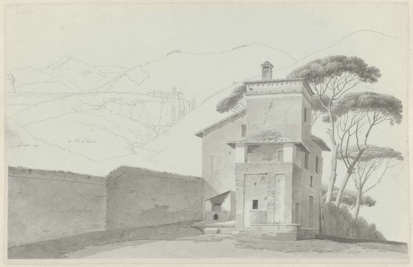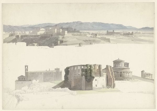 Curator: Welcome. We're standing before Josephus Augustus Knip's "View of Roviano, Houses in Rome in the Foreground," a pencil drawing likely created between 1809 and 1812. Editor: Oh, this has such a hushed, almost ghostly quality. The buildings look like they're emerging from a dream. It’s beautifully muted. Curator: Yes, the restrained palette certainly contributes. The drawing emphasizes the architectural structure. Note how Knip meticulously renders the geometry of the buildings, balancing line and shadow to create a sense of depth and volume. The cityscape composition firmly roots the drawing in realism and adheres to some conventions within the Neoclassical movement. Editor: Right, but there's also something unfinished about it, especially with the distant mountains merely outlined. It reminds me of Piranesi, but with a gentler, more hopeful light. Curator: An astute comparison, considering the architectural subject. Unlike Piranesi’s dramatic exaggerations, however, Knip's precision presents these buildings within the serene order of a classical landscape, while those incomplete distant marks serve to amplify that order as much as ground the perspective. Editor: Perhaps. To me it gives it a sense of fleeting observation, as if Knip captured this view on a morning walk. It really highlights a contrast between the man-made buildings and the sublimity of nature. Is that scribbled text up above a series of his own notes? Curator: Precisely. Those notations function like a personal index, mapping out landmarks across the vista to fix them within memory or future compositions. They allow a peak at artistic decision making! Editor: Fascinating. So, what initially seemed like a straightforward depiction transforms into a window into the artist's mind. A subtle dance of intellect and atmosphere, isn’t it? Curator: Exactly. It’s a fascinating document and distillation of a specific time, place, and aesthetic sensibility, a unique piece worth our careful attention. Editor: Well said, and an enduring reminder that the simplest strokes can sometimes hold the most complex of insights.
