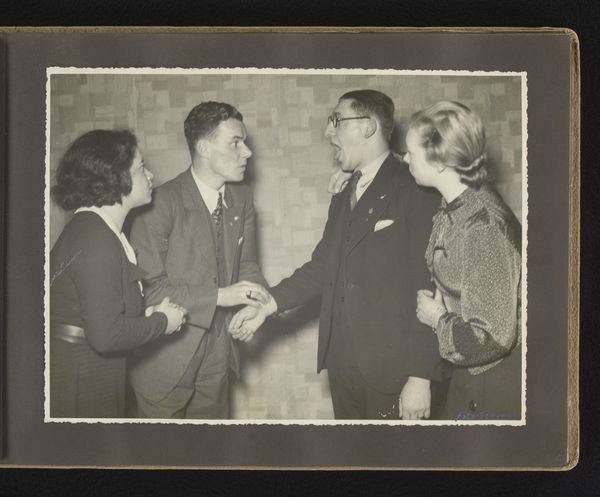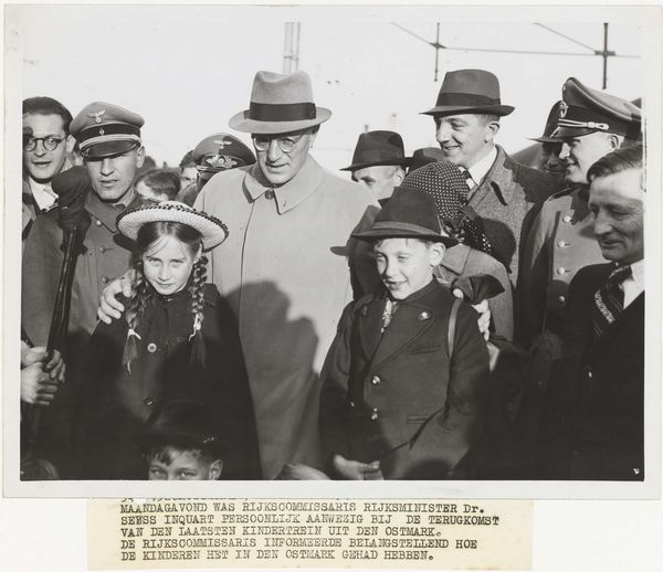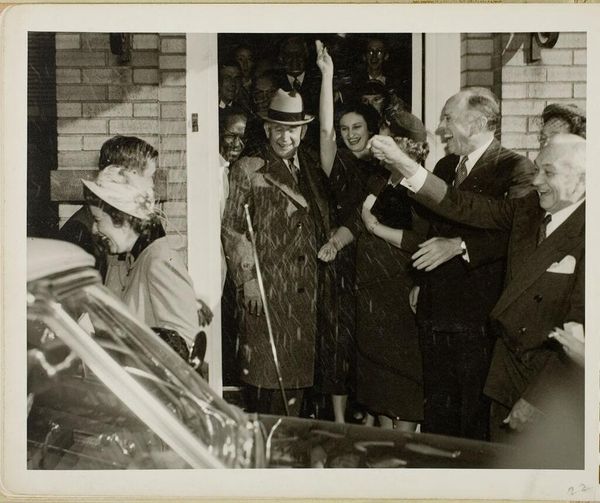 Curator: Oh, the sweet smell of champagne and anticipation! Look at this slice of Parisian nightlife from 1948, captured by the Keystone Press Agency. It's titled "Maurice Chevalier opent cafe-chantant, Montmartre." Editor: It’s funny how history becomes like an old, beloved photo album, slightly sepia-toned in our memories, regardless of the actual image! This feels exactly like that. A very public moment caught candidly—I get a rush of joie de vivre, like you're about to hear secrets whispered from a bygone era. Curator: Absolutely! Chevalier is the man wielding the bottle as if it’s a magic wand. To me, champagne has always symbolized transformative moments; an alchemical brew as old as theatre and, often, just as dramatic. This photo captures a threshold moment for this new space. Editor: And see how he’s opening it not with a gentle twist but what looks like a saber?! That aggressive flourish reminds me of certain figures cutting through the old world on the rise. Curator: He knows how to make a grand entrance! Also note how the people around him have mixed reactions—amusement, expectation, pride… each a small story within the bigger one. This array captures the mix of emotions and energies that opening night in a public setting would certainly trigger. Editor: Exactly! It's a study in public emotions, framed against what I'm guessing is the café's promotional signage: faded posters, bold lettering. What I appreciate most is the child holding the microphone. What could this represent in terms of popular culture, media, entertainment... It’s such an intriguing symbolic layer here, juxtaposed with that celebratory champagne burst. Curator: The future of entertainment itself, being handed the mic? Beautifully stated. You are right, this gesture does signal transition but also the cyclical nature of performance and memory. This photograph leaves you with more questions than answers. It’s quite charming. Editor: Definitely food for thought about entertainment then and now, its ritual and icons. A lovely artifact and the more you analyze it, the more that the image blossoms.