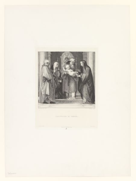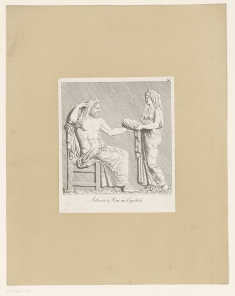 Curator: This rather charming print is entitled "Clio en Urania," created around 1851 by Julien-Léopold Boilly. I'm struck immediately by how ethereal the two figures look on this pale toned paper. Editor: Yes, it does have a delicate, almost neoclassical feel. What resonates with me is how Boilly, a well-known genre painter, turns to these allegorical figures. He is known for scenes of everyday Parisian life, so seeing him depict the Muses feels… deliberate. Why Clio and Urania, I wonder? Curator: Perhaps it speaks to his aspirations beyond the everyday. Clio, muse of history, and Urania, muse of astronomy – it is a pairing which elevates the subject beyond fleeting moments. In this context, the aged paper becomes almost a historical artifact in itself, giving visual and tactile dimension to Clio's historical significance. Editor: Indeed. Consider how academies in the mid-19th century were establishing hierarchies of art. Genre painting, while popular, was seen as "lesser" than history painting. This image could be read as Boilly trying to engage with and legitimize history, perhaps staking a claim for a more elevated status. Note the prominent globe – a potent symbol, it would be worth considering where and how the artwork was shown. Was it to participate in any particular scientific or cultural discussion of its time? Curator: And doesn’t that globe symbolize, too, the ambition of historical narratives themselves? It offers this invitation into worldviews, from one era to another. The light colors soften this ambition slightly – but those details of clothing, the facial expressions… these still connect directly across time. It has echoes of a Roman fresco. Editor: Exactly! Even though printed, the detail evokes monumentality. It serves almost as a record of knowledge and authority as established and understood then. It reminds us that what seems "classical" now was once a contemporary mode of expression shaped by institutional ambitions and socio-political climate. Curator: I suppose that’s why I find this dialogue of two muses so compelling. On the surface it's a tribute to classical ideals, but beneath, it murmurs of artistry navigating its own era. Editor: Yes, an artwork reflecting upon history whilst simultaneously becoming a part of it. That’s what really sticks with me now.
