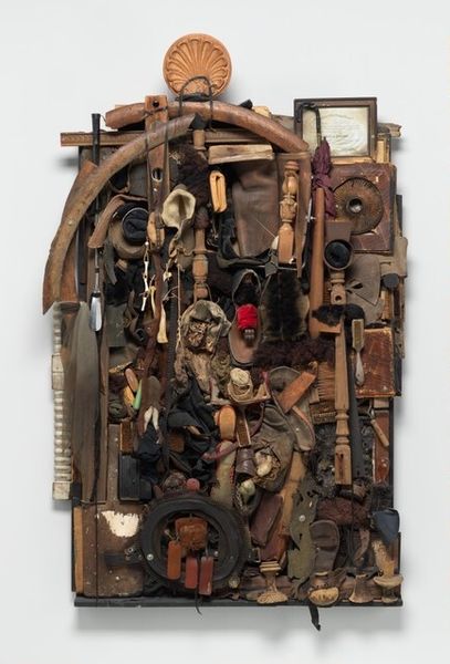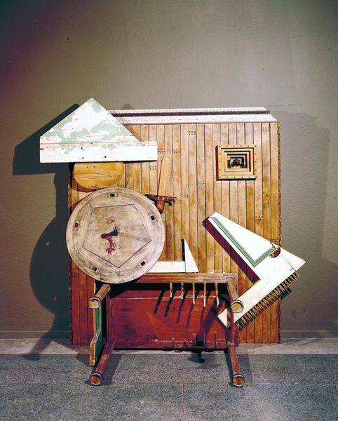 Editor: This is Bill Woodrow's "English Heritage - Humpty Fucking Dumpty," housed at the Tate. It's a large sculpture, primarily constructed from wooden boxes and other found objects. I'm struck by how precarious and unstable it looks. What does this imagery evoke for you? Curator: The Humpty Dumpty image is potent. The nursery rhyme figure is, of course, about a great fall. In Woodrow's hands, does the image of the nuclear symbol on one of the crates suggest a post-nuclear fall of civilization? Editor: That's a compelling interpretation. The nuclear symbol definitely adds a layer of anxiety to the already unstable form. Curator: The artist makes us think about cultural fragility in the face of technological and environmental dangers. It all seems very current. Editor: I didn't think of it that way. I see now a fusion of childhood innocence and impending doom. Curator: It highlights how symbols can unexpectedly tap into our deepest collective fears.