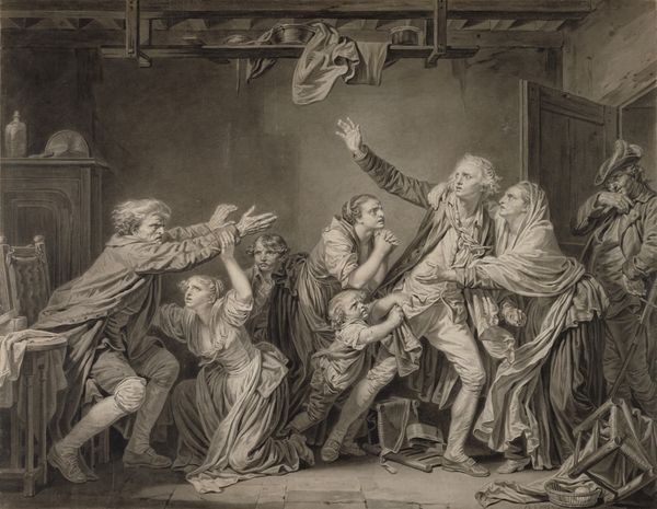 Editor: So, this is "Philosophus udi egen Indbildning, V. akt, 7. scene" painted in 1814 by C.A. Lorentzen. It looks like a scene from a play, or maybe an opera? There's a lot of drama and emotion in it. What strikes you most about this piece? Curator: Ah, yes, Lorentzen's tableau! To me, it's like stumbling upon a whispered secret. The monochrome palette directs us away from mere spectacle and towards the emotional undercurrent. I'm drawn to how he captures a pivotal moment. The tension, frozen in time, do you feel it too? Like the air is thick with unspoken words? Editor: Definitely, the expressions are so intense, yet muted by the lack of color. I’m curious about the staging; it's almost theatrical. Do you think the artist was intentionally drawing a parallel to the stage? Curator: Absolutely. Lorentzen was acutely aware of theatre's power. See how the figures are arranged almost like actors on a stage? The lighting seems deliberately placed to amplify their emotions. That woman in the center, the heroine perhaps, extending her hand, there is resolve but there is also hurt. A delicious cocktail for narrative and reflection. It does tickle that little "what happens next" area of my brain, doesn't it? Editor: It really does. I think looking at the painting in this detail provides a very interesting insight into the time period. Curator: Precisely. Art serves as a window to the past. It shows how artists used theatre, composition, light and shade to portray and explore emotions in Neoclassical times. We, too, now gain the experience as witnesses to their life and emotions, and the gift to muse about its interpretation.