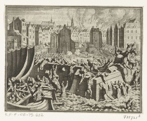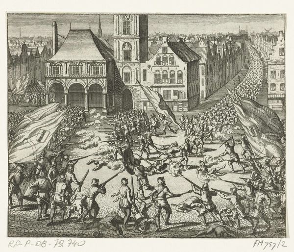 This anonymous engraving, titled Staatse troep verslagen op de Dam, 1577, captures a moment of brutal conflict with remarkable detail. The composition is dominated by a chaotic mass of figures, a jumble of limbs and weapons rendered in stark black lines against the white of the paper. The scene is structured by linear perspective, drawing our eye into the depth of the Dam Square. Buildings loom in the background, framing the violence and grounding it in a specific locale. Look closely at the lines: they define not just form but also texture and movement, conveying a sense of frenzied action. The artist masterfully employs hatching and cross-hatching to create tonal variations, adding depth and volume to the figures and architecture. The use of line is not merely descriptive; it's expressive. The density of the lines in certain areas, particularly around the central conflict, creates a visual tension that mirrors the intensity of the battle. This print serves not just as a historical document but as a complex interplay of form and content, challenging us to look beyond the immediate scene of violence.