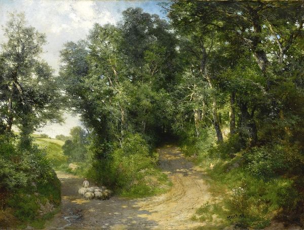 Editor: Here we have Camille Pissarro's "Edge of the Woods Near L'Hermitage, Pontoise" painted in 1879, using oil paint. I'm immediately drawn to the dense green foliage, it almost feels claustrophobic, yet there is a house in the background which is very interesting. What strikes you most about it? Curator: Considering the socio-political climate of France during the late 19th century, this scene becomes quite poignant. Pissarro painted this shortly after the Franco-Prussian War. Does the seemingly ordinary landscape resonate differently when you consider the national mood following such a conflict? Editor: That's fascinating, I didn't know that! It adds a whole new layer of meaning. I was focused on the way the light filters through the trees and how that is kind of a traditional Impressionist touch. Curator: Precisely! But think about Impressionism’s rejection of academic art, which often glorified war and the powerful. Pissarro instead directs our gaze towards the recovery and resilience found in everyday life and the land itself. Who do you think this painting serves? Editor: So, he's turning away from heroic depictions to something more… communal? Perhaps even a commentary on what *actually* matters to the French people, as opposed to grandiose military victories? I think that perspective brings into play notions of land ownership, community, and the changing face of the French countryside due to industrialization. Curator: Absolutely! Pissarro subtly challenges the established narrative, making us question whose stories are valued and immortalized on canvas, while also painting the everyday. Editor: I had no idea there was so much behind such a seemingly simple scene. It's much more profound. I see it, thanks to you! Curator: It reminds us to question the dominant narratives and value art's potential to represent diverse experiences and perspectives.