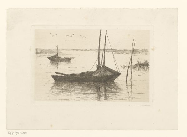 Curator: This is Charles Adams Platt’s "Harbor of Naples," an etching dating back to the 19th century. Editor: Immediately, I'm struck by its serene yet almost melancholic tone. The soft sepia of the etching emphasizes the stillness of the harbor scene. Curator: Platt masterfully captures the energy of a port city, doesn't he? Harbors, throughout history, are about arrival and departure, commerce and culture, promising both excitement and potential loss. There is always that bittersweet element. Editor: Absolutely. Structurally, look at how he positions the cluster of boats towards the right, counterbalancing the expanse of water that pulls the eye into the distance. The composition has a powerful sense of balance, drawing the eye back and forth, like the tides. Curator: Boats often serve as symbols of transition. Here, their disarray hints at the complex inner lives and collective narratives swirling beneath the harbor’s placid surface, stories of journeys undertaken and lives transformed by these travels. Editor: Note too, how Platt uses the etched lines themselves— the density and direction. It adds texture. The ripples on the water have directionality that emphasizes movement, while the dense cross-hatching used on the closest boats adds palpable weight and texture to those boats. Curator: He does give real weight to the everyday lives, doesn’t he? You imagine not just the grand departures but also the lives of ordinary fisherman and dockworkers, rooted there at the edge. Naples itself, with its distinctive silhouette, acts as a familiar anchor in the distance. Editor: I see how the print balances formal sophistication with narrative implication. Curator: Indeed. Platt presents us with both an aesthetically pleasing and psychologically intriguing vision of this liminal space. Editor: A beautiful reminder of the rich complexity beneath simple appearances.