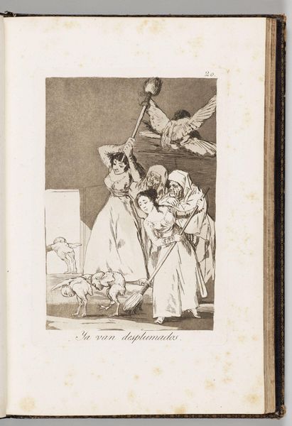 Curator: Let's turn our attention to "There Go the Plucked Ones" by Francisco José de Goya y Lucientes, currently housed at the Harvard Art Museums. Editor: Oh, goodness, it’s got such a frantic, surreal energy. Those figures look like they’ve stepped out of a nightmare, all sharp lines and unsettling gestures. Curator: Indeed. The dynamism of the scene is achieved through Goya’s manipulation of line and shadow. Note the contrasting textures – the smooth gowns against the craggy faces. Editor: I wonder, is it just me, or is there a powerful sense of feminine rage bubbling beneath the surface? The central figure with that staff, ready to strike, is just amazing. Curator: The subtext is fascinating. Semiotically, the plucking could represent the stripping away of beauty or innocence, perhaps alluding to societal exploitation. Editor: I love how Goya manages to combine the grotesque with the beautiful, making you question everything you think you know about power and vulnerability. It's haunting. Curator: Quite so. It’s a testament to Goya’s formal genius that it manages to distill such complex societal critiques into such a small, impactful composition. Editor: Exactly. A small piece, but with layers and layers of meaning. Definitely leaves you with more questions than answers, which, I think, is just brilliant.