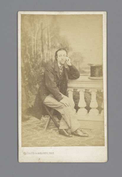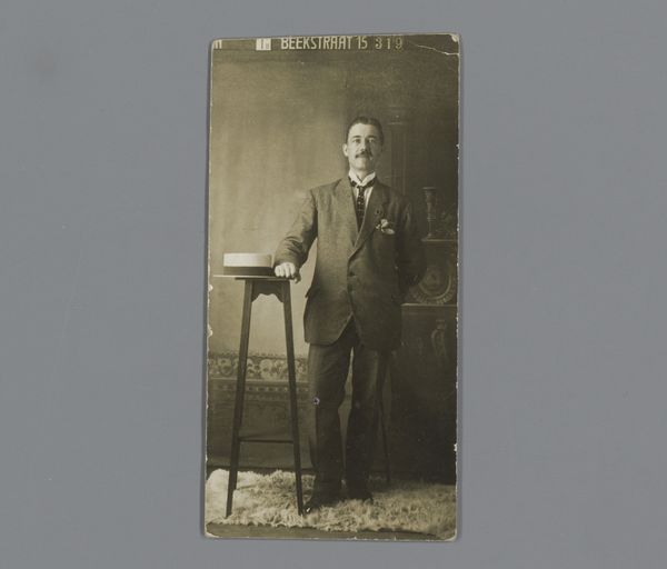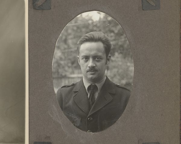 Curator: Looking at this, I am immediately struck by a sense of quiet dignity. There’s a formal, yet melancholic air about it, wouldn't you agree? Editor: Indeed. We are viewing a gelatin-silver print, a photographic portrait dating from sometime between 1930 and 1935. Its title is “Portret van Johannes van Zijll de Jong.” What’s intriguing is the confluence of modernist and realist styles present in the piece. Curator: The subject's crossed hands, the subtle landscape blurred in the background - it all suggests a particular kind of introspective authority that feels very… 1930s, doesn’t it? Perhaps even informed by an awareness of the changing social landscape. Editor: Certainly. Photography during this era increasingly engaged with capturing the nuanced realities of human experience. This particular portrait also seems to exemplify how individual identity was being publicly shaped during an era of vast cultural shifts and growing uncertainty. Curator: It's more than just a likeness; it’s an assertion of identity against that uncertainty. Note how he’s positioned against the landscape, both grounded and yet slightly disconnected. It is such an interesting interplay between permanence and fleetingness. The photograph has all of those associations baked in! Editor: Precisely! The composition places him as a figure both within and slightly detached from the natural world, hinting at the growing divide between humanity and nature that characterizes much of modern experience. Consider also the deliberate lack of embellishment—the simple attire and setting—all working toward constructing an accessible, if somewhat serious, image. Curator: Yes, a very human image that asks more questions than it answers. An intimate snapshot, really. Editor: Ultimately, what strikes me most is how it captures a very particular historical moment – the rise of mass media, anxieties around representation and authenticity, the emergence of celebrity culture – all filtered through this very intimate, seemingly simple portrait. Curator: It makes one think about what this image represents of his sense of self, doesn't it? It offers such an understated sense of selfhood. Editor: I'd say that this photograph quietly invites a contemplation about how identity is created in public through simple portraiture.