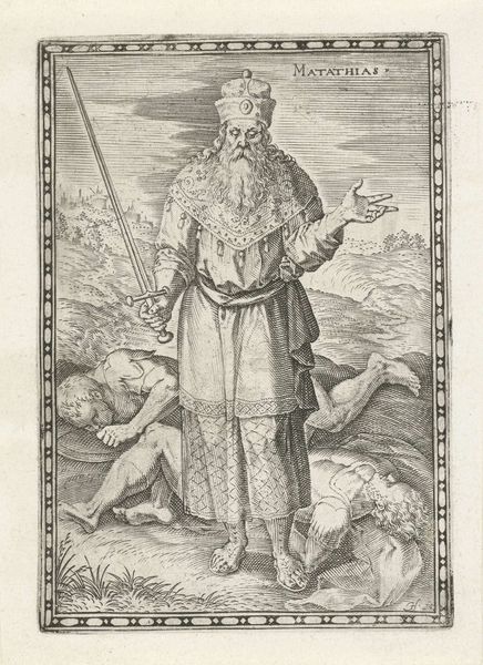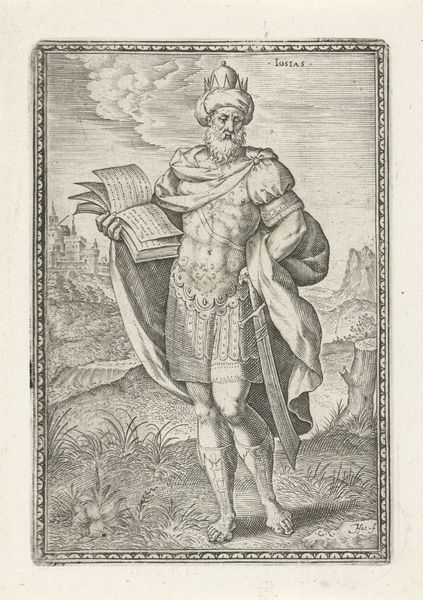 Editor: This is "Gad" by Johann Sadeler I. It’s a print, and the figure is so muscular and dominant in the frame. What strikes you about its composition? Curator: Indeed. Note the intricate network of lines forming the textures—the feathered helmet, the musculature, the landscape. How do these formal elements contribute to the overall sense of power? Editor: It does create a hierarchy, focusing attention on the figure's physique. Curator: Precisely. Consider, too, the balance of light and shadow and how the artist uses line to define form and texture. These formal elements speak to a clear attempt to establish the subject's heroic stature. Editor: I see it now. It’s fascinating how much can be conveyed through form alone. Curator: Quite so. Form dictates content in this striking piece.