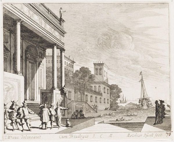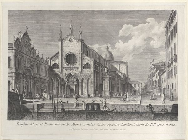 Curator: Before us is Michele Marieschi’s "Campo Santi Giovanni e Paolo te Venetië", dating to 1741. This print, using etching and engraving techniques, captures a bustling Venetian cityscape and is held at the Rijksmuseum. Editor: It's quite striking, almost theatrical. The way the light falls across the square, illuminating the church facade... there’s a definite sense of importance attached to the scene. A monument, surely, in the center? Curator: The monument is of Bartolomeo Colleoni, an Italian condottiero. The engraving beautifully depicts the detailed brickwork of the Basilica di San Zanipolo and surrounding structures, revealing much about 18th-century Venetian architectural practices. Notice the way Marieschi employs line variation. It gives depth to what could be a flat, representational image. Editor: I'm immediately drawn to the gondolas, symbols of Venice itself, smoothly gliding through the waters in their traditional forms. There are lots of geometric patterns within the etching—consider how they interplay with the clouds and building facades. One could argue that the composition presents Venice as a place of geometric precision, carefully ordered even within the bustling, quotidian environment. The activity itself carries a symbolic load; Venice, a place of trade, of human interaction. Curator: I agree. These details illuminate social class. The labouring figures carrying goods on the square tell a very different story to the image conveyed by gondolas. Consider the conditions under which this work was created, reproduced as prints accessible beyond the wealthy elite. Marieschi’s craft mediates the perception of Venetian society. Editor: Absolutely. What resonates for me is how it takes on cultural meanings even now. The iconic church. That equestrian statue—those are emblems we still associate with Venice's layered past. Seeing them evoked with this level of detail offers an enduring reminder of history. Curator: Seeing how the process of producing such prints makes such iconic emblems available to a wide audience provides some food for thought about access, knowledge and dissemination. Editor: Definitely. And perhaps even challenge the canon too. Thinking about Marieschi’s choices around how and what to highlight gives a very different inflection compared to contemporary landscapes and cityscape painters from other cultural spheres. Curator: It has been wonderful exploring how materials and symbolism blend. Editor: Yes, this etching does more than capture a likeness; it preserves a memory, in both craft and iconography.
