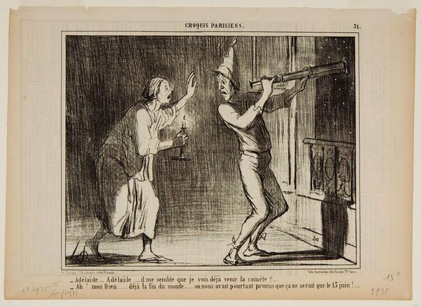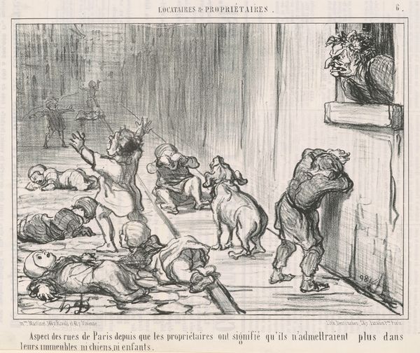 Curator: I'm struck by the immediate distress portrayed in this lithograph, dating from the 19th century by Honoré Daumier. The long, thin lines seem to convey panic and violence so effectively. Editor: The means of its production speak to its purpose, doesn't it? A print allowed for wider circulation, implicating Daumier’s commentary on Parisian society and perhaps, class relations as they played out materially on the street. The rough quality further amplifies the grit of its subject. Curator: The scene depicts, on one level, violence enacted on animals; dogs hunted and killed. However, consider the upright canine on the balcony. What does it symbolize as it witnesses the turmoil, seemingly declaiming some unseen injustice? It evokes the ancient theatrical character, Andromache, railing against fate. Editor: Let’s remember Daumier’s skill with lithography; the gradation in the grey wash builds up a sense of volume. What is most poignant for me, however, is the physical presence of the figure dragging the dead animal; the man embodies labor, implicating society’s complicated relationship with these creatures, with animals becoming almost utilitarian within an expanding urban landscape. Curator: It is more than utility! It delves into humanity’s cruel streak; note how the hunters actively celebrate in a way which implicates all in a dark morality play. The visual vocabulary draws upon long traditions of depicting human struggle, recasting it within this contemporary, urban environment. Editor: Yet, in a mass produced image we have immediate distribution! By understanding it as such, the image functions as a prompt for those same observers of injustice, to potentially act, and change this violent cycle… Or maybe to merely sell newspapers, I admit! But consider too: from a stone block, a poignant sense of struggle rises, a dark material critique that makes it hard to simply dismiss what is depicted, nor its creation as merely neutral. Curator: Agreed, understanding the print's wide reach allows a powerful voice of the animal's lament. A visceral critique indeed, where the line between the symbolic and lived pain dissolves. Editor: Exactly. Through careful examination of materiality and wider distribution of the artwork itself, we come to truly consider, on a grander level, society and ethics together.