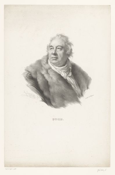 Editor: This is a pencil drawing called "Portret van Jean-François Ducis" made around 1827-1830 by Bernard Romain Julien, housed here at the Rijksmuseum. The fur collar around his shoulders feels really luxurious. What strikes you most about this piece? Curator: It is indeed luxurious. More importantly, how does the portrayal of Ducis, specifically his clothing and its details, reinforce or challenge societal expectations of status and intellect in post-revolutionary France? Is this an attempt to reassert pre-revolution ideas of nobility by association, through visual markers like luxurious garments? Editor: That's a great point. I hadn’t considered the political implications of something like a fur collar. So, it's not just about wealth but also about subtly referencing an older order? Curator: Precisely. Think about how artists working after the French Revolution navigated depicting individuals. Portraiture became a powerful tool for either solidifying the new order or, conversely, hinting at a nostalgic return to previous structures. Is this portrait participating in a quiet kind of political debate about what kind of French society is acceptable now? Editor: I see. The artist is making choices that signal something about Ducis and potentially about the artist's own political leanings as well. Did the Rijksmuseum play a role in either solidifying new power structures, or in expressing quiet forms of resistance or critique? Curator: That’s an excellent question. The establishment and growth of national museums such as the Rijksmuseum was fundamentally a part of nation-building. What kinds of works are actively collected? Whose narratives were considered to be “national” narratives? How was art employed in forging the very idea of “Dutchness,” as it were? Thinking along those lines is the way we can best begin to think historically about the institution’s practices and assumptions. Editor: This has totally changed how I see portraits. Thanks so much! Curator: My pleasure! It's always fruitful to consider how art exists within a larger framework of social and political influences.