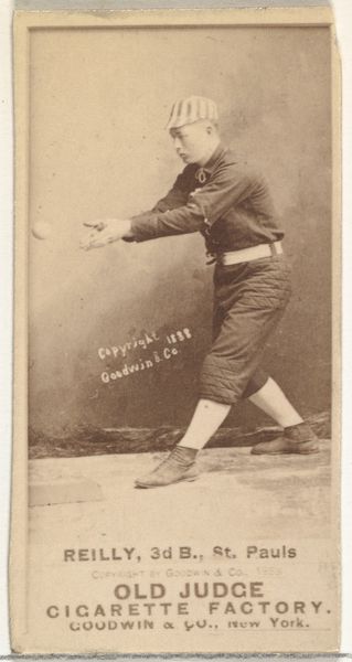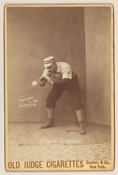 Curator: This is an albumen print from 1887, made by Goodwin & Company as part of their Old Judge Cigarettes series. It depicts Mack, Catcher, Washington, a baseball player. Editor: He looks poised, almost crouching like a panther ready to pounce. It's the anticipation, you can feel it. Funny, the sepia tone lends this such a dreamy, wistful air—and yet there's that sharp focus on his posture and gaze. Curator: These cards were actually included in cigarette packs, a clever marketing strategy to appeal to baseball fans. They are a fantastic insight into the cultural significance of baseball at that time. Sport was rising in the collective public awareness in the second half of the 19th century. Editor: Marketing genius! But also… kinda romantic. Imagine finding this card nestled in with your tobacco. Like finding a secret poem dedicated to American athleticism. He is just standing there but what I really like in this is the ball that is suspended in mid-air; I imagine that this detail transports you into a moment when things start to happen and transform from a tranquil scene into a thrilling play. Curator: The “Old Judge Cigarettes” series in general offer fascinating insight into how athletes became popular figures and into how their image was disseminated widely in this specific socio-economic context. Consider how photography played a crucial role here too, immortalizing and packaging players as commodities. Editor: Absolutely. And I love how his clothing has those late 1800's vibes, while he could stand here among us and fit as well in this place with very few adaptations! Time travelling photography, just think about that. It's kind of beautiful and melancholy, you know? Like catching a faded echo of something heroic. Curator: It makes one think about fame, really, and how it functions. It gives me chills thinking about all the aspects involved in constructing celebrity—past and present. Editor: Well, now I see this not just as a portrait of Mack, but a picture of something that never ages… thanks for pointing it out. Curator: My pleasure.