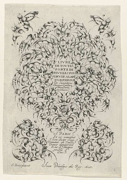 Editor: Here we have François Lefebure’s “Titelprent: Livre de Feuilles et de Fleurs,” created in 1661. It’s an engraving, incredibly detailed, depicting an elaborate floral wreath. What strikes me most is the contrast between the intricate floral design and the precise depiction of the city below. What do you see in this piece? Curator: I observe a clear visual hierarchy established through form. The composition emphasizes the wreath's ovular structure. The artist carefully arranged a multitude of floral elements. The rhythmic repetition of the leaves and blossoms create a closed visual circuit. The city acts as a contrasting base, grounded in geometric, ordered shapes compared to the organic floral frame. Editor: The level of detail is amazing, given the medium! How does the materiality of printmaking affect the overall impact? Curator: The linear quality inherent in engraving enables precise, crisp contours. Look closely; notice the meticulous cross-hatching used to model depth. The interplay of light and shadow accentuates texture. The entire effect speaks to a calculated pursuit of clarity. Editor: It seems like this artwork really demonstrates a focus on structure. Thanks for this enlightening interpretation. Curator: Indeed. Examining form allows us to comprehend its fundamental visual components. Now I am curious to research more about Baltazart Moncornet's technique.