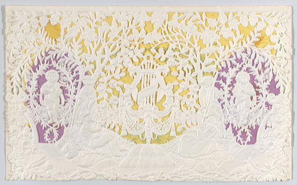 Curator: I find myself drawn to the delicacy of this piece, an etching titled "Bedspread," created around 1936 by Irene Schaefer. It's incredibly detailed. Editor: Intricate. Almost overwhelmingly so. My immediate sense is of intense labor. The texture creates a hushed, almost reverential mood. Curator: Etchings such as this offered patterns for domestic craft, a way to introduce bespoke elements into the home during the interwar years. It echoes traditions of handcraft even as industrial printing gained traction. Editor: And look at the density of the pattern itself. The basket of flowers motif seems fairly traditional, but the repetition and layering create a sort of optical vibration. I find that really striking, the way the image almost destabilizes. Curator: Absolutely. The floral patterns, the circular format...these are deeply resonant with folk traditions associated with the home. Floral motifs have long been connected with femininity and domesticity. Do you think there is also an aspiration beyond mere replication implied, as craft gives way to mass production? Editor: Perhaps. The organic pattern fights against its own geometry, becoming something more abstract than simply "decorative." It’s as though it anticipates future developments in textile design, bridging a domestic tradition and modern design principles. Curator: Thinking about those organic patterns in conjunction with the mechanical processes used to produce the etching brings in interesting considerations of technology, the changing roles within domestic life, and female authorship in design at this period. Editor: It really underscores how even seemingly simple domestic designs can embody so many layers of artistic and cultural intention. It rewards slow looking. Curator: Indeed. Hopefully listeners will be intrigued enough to spend further time exploring such fascinating intricacies. Editor: Definitely. Each layer peels back to reveal further complex nuances of construction.