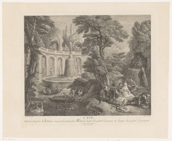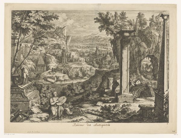 Curator: Jean Jacques Le Veau created this engraving, titled "Herders en reizigers bij een fontein in een landschap met ruïnes," sometime between 1739 and 1786. Editor: The overall effect is one of pastoral decay, or maybe more accurately, a serene contemplation of impermanence. The composition really emphasizes this with the crumbling architecture juxtaposed with the calm herds. Curator: Yes, there's a profound visual tension. Those ruins aren’t merely decorative; they carry the weight of a vanished civilization. Note the Romanesque influence, tinged with early Neoclassicism – it speaks to a deep-seated cultural memory and a longing for a glorified past. The shepherds become symbolic of an enduring humanity that exists in counterpoint to historical decline. Editor: Agreed. The lines are meticulously etched, really delineating the textures – the rough stone, the soft wool of the sheep. It's fascinating how the artist has used varying densities of lines to create depth and suggest a hazy atmosphere. This engraving process creates a specific visual language of light and shadow. Curator: Absolutely. The classical elements, blended with the quotidian life of the herders, invites contemplation on the cyclical nature of existence and civilization's footprint across time. Consider the fountain, seemingly still offering respite amid the wreckage, and the human instinct to continue onward despite ruin. Editor: And even in this ruin, there's a striking symmetry. The arrangement of elements draws my eye repeatedly from one side of the engraving to the other. The eye leaps and balances – truly sublime craftsmanship in a carefully structured pictorial field. Curator: I think we can agree the print offers a resonant narrative—one of lost glory and simple human endurance, encapsulated within the stark beauty of the etched line. Editor: Yes, it really demonstrates how an image can carry such a dense cluster of formal properties and conceptual information about civilization.