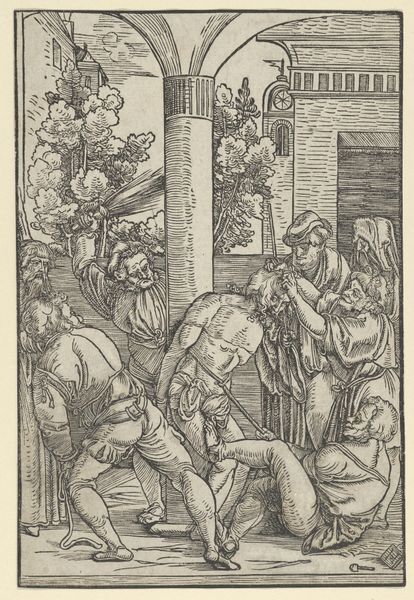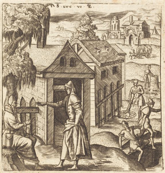 Curator: This captivating engraving, "Fotoreproductie van de gravure Les couvreurs sur le toit," was created before 1860 by Edmond Fierlants. The title translates to "Photographic reproduction of the engraving The Roofers on the Roof." Editor: Oh, my gosh! It looks like a scene from a medieval fairytale. But there’s also an unsettling quality to the composition that gives me the creeps. Is this some sort of angelic home improvement service? Curator: It does present a rather peculiar scene. Note the inclusion of angelic figures amidst earthly laborers. These roofers, hard at work, share the scene with divine beings ascending ladders— a rather striking juxtaposition, isn’t it? We have the grounded, tangible world overlapping the symbolic one. Editor: It totally flips the whole 'guardian angel' trope. Like, instead of just watching over, they are participating in the labor itself. And look at the figure seated reading—oblivious, or perhaps deeply connected to this blend of reality and the ethereal. I'm just saying... I would double-check their work. Are they up to code? I would hire a medieval home inspector pronto! Curator: Exactly! The seemingly mundane task of roof repair becomes imbued with deeper meaning, potentially referencing themes of divine assistance in human endeavors or a fusion of the earthly and spiritual realms. Angels were very busy at this time, so why not roof repair on their checklist. The iconography definitely leans into the allegorical possibilities prevalent in art from this era. Editor: Absolutely. It makes me wonder what "invisible" help we receive or offer to others. Maybe it's a call to recognize how even the most mundane tasks can take on spiritual weight when approached with care. And the style reminds me of, I don't know, a rough sketch, and gives it all that dreamy quality! Curator: A valid point, It is this attention to form that helps make such works enduring touchstones. It serves to expand our insight. Editor: Absolutely! Makes me want to try to fix things and seek celestial assistance!