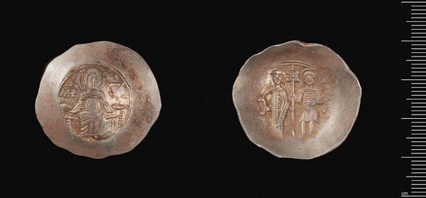 Curator: These small silver coins, attributed to Manuel I, each weighing just 4.56 grams, open a window onto the Byzantine economy and the symbolic power of the emperor. Editor: There’s an almost ethereal quality to them, isn't there? The images are so delicately impressed; it's amazing they survived in such detail. Curator: Absolutely. The production itself speaks volumes. Consider the labor involved in creating the dies, the mining of the silver, and the controlled minting process. It all points to a centralized authority projecting its economic and political might. Editor: And the composition—the careful arrangement of figures and inscriptions within the circular space. Note the stylized rendering of the emperor on one side, and the Virgin Mary enthroned on the other. It's a masterclass in miniature design. Curator: Precisely. These images weren't just decoration; they were key tools in conveying imperial authority and reinforcing religious legitimacy among the populace. Every coin was a piece of propaganda in circulation. Editor: It's fascinating to view an object that feels both precious and utilitarian. It truly demonstrates how form and function were inextricably intertwined in Byzantine culture. Curator: It does make you consider the relationship between rulers and their subjects. Editor: Yes, indeed. A potent little object.