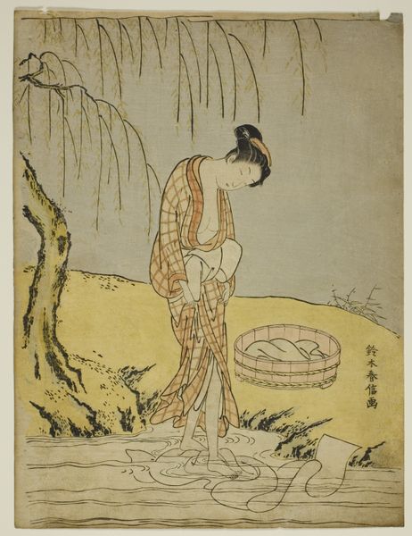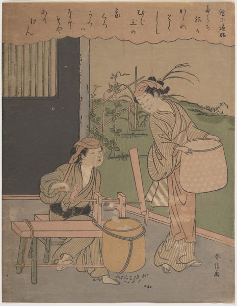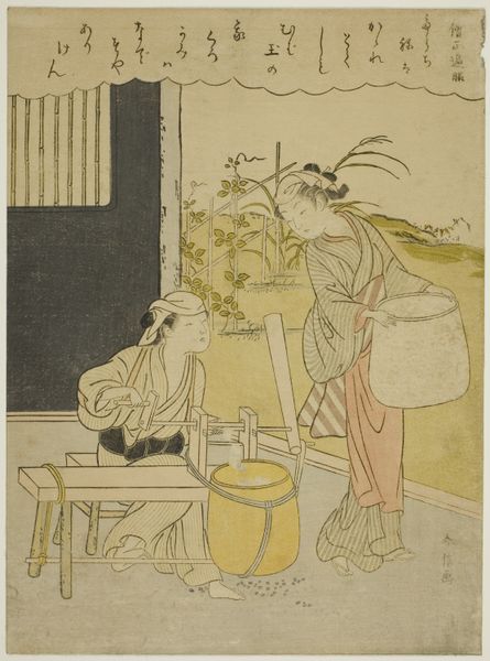 Editor: So, this is Suzuki Harunobu's "Two Women Washing Their Hair," a woodblock print from around 1767 or 1768. It's really delicate and intimate; almost voyeuristic. What do you see when you look at this print? Curator: I see a fascinating intersection of private ritual and public consumption, steeped in the sociopolitical context of Edo-period Japan. How do these women’s actions challenge or reinforce the social roles they are expected to fulfill? Editor: That's a great point! I was so focused on the visual aspect, I hadn't thought about how it reflects the culture. The way they're depicted... is there commentary on class or gender roles embedded there? Curator: Precisely. Ukiyo-e prints, while seemingly depicting everyday life, often served as sites of negotiation for identity. The figures depicted, are they idealized representations of women, or are they speaking to the realities faced by women navigating social expectations of beauty, domesticity and, potentially, sexuality during that time? What's suggested by this quiet scene of women in domesticity? Editor: So, by observing the way Harunobu portrays them, we can glean insights into those social structures and perhaps even their unspoken desires or challenges? It makes the piece so much richer. Curator: Exactly. And think about who had access to these prints and the message being sent to this audience. Consider how access and the consumption of art in that era was dictated by social factors like gender and class. Editor: I'm seeing so much more depth now. It’s not just a pretty picture; it’s a social document of sorts! Curator: Indeed. These women challenge prescribed notions of beauty, but we also should be wary of a Western gaze. Hopefully we've opened a dialogue to see beyond a surface reading. Editor: Absolutely. I’ll definitely look at art with a more critical eye now. Thanks for broadening my perspective.