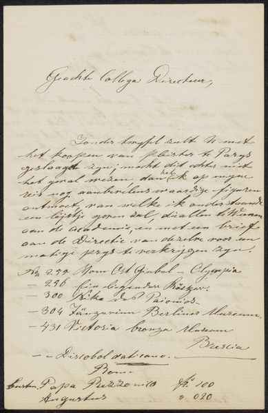 This letter to Anthonius Wilhelm Cornelis Berns was produced by the Rijksakademie van Beeldende Kunsten in Amsterdam on December 25th, 1889. Written in elegant, looping cursive, the note appears to be a record of prices for plaster casts of sculptures, potentially for an upcoming exhibition. The very act of handwriting connects us to the laborious administrative processes that underpinned the 19th-century art world. Before typewriters became widespread, the physical effort of writing letters like these was considerable. The penmanship itself becomes a form of craft. We can also consider the social context: plaster casts were a popular and relatively inexpensive way to disseminate sculpture. This letter shows how art academies balanced artistic aspirations with the practicalities of commerce and promotion, offering insights into the networks of exchange that supported artistic production. It reminds us that even seemingly mundane documents can offer valuable insight into the business of art.