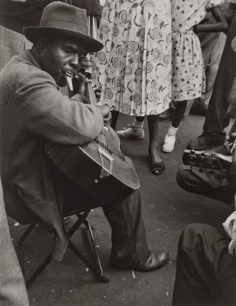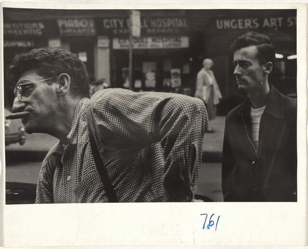 Robert Frank took this photograph, Man waiting to cross street--Los Angeles, at an unknown date. It's a small black and white photograph, but it feels so big, doesn't it? The way Frank uses light and shadow is so subtle and gritty, almost like he is revealing more than simply documenting. Look at how the soft light falls on the man's back, making him almost glow against the dark street. The hands are nervously clasping something – maybe a crumpled napkin, maybe nothing – and the gesture becomes a focal point, drawing our eyes in. The texture of the man's jacket, caught in that perfect light, feels almost tactile. It reminds me a little of Walker Evans, but Frank's got a rawness that’s all his own. This photograph embraces ambiguity, leaving space for us to bring our own stories.