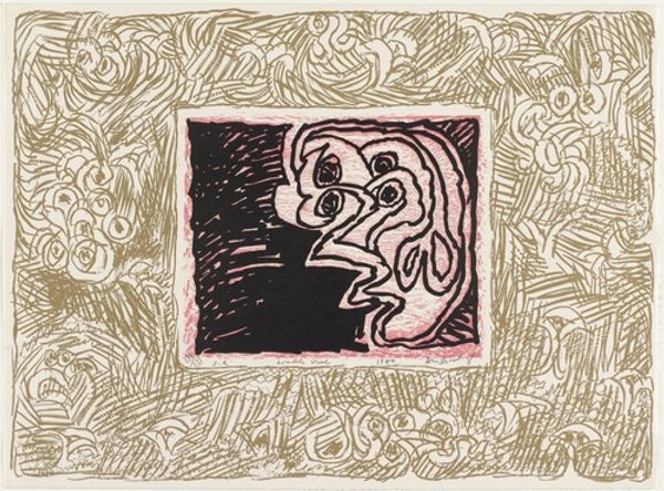 Pierre Alechinsky created "Veiled Like a Young Bride" in 1975. The lithograph presents a central image of red and blue lines, which might evoke feelings of obscured emotion, or perhaps a transformation. The composition is structured in a unique way: a central white space filled with abstract shapes is bordered by a series of small, framed vignettes. These border images, rendered in darker tones, create a visual dialogue with the central form. The red and blue lines create a sense of depth and movement, while the contrasting colors evoke both tension and harmony. Is Alechinsky referencing the semiotic potential of color? Are the border images intended as framing devices, offering alternative perspectives? The title itself invites a layered interpretation, suggesting themes of innocence, mystery, and revelation. This allows us to consider how these visual elements reflect broader artistic and philosophical concerns, destabilizing established meanings and engaging with new ways of thinking about representation.