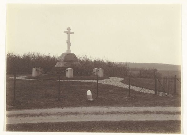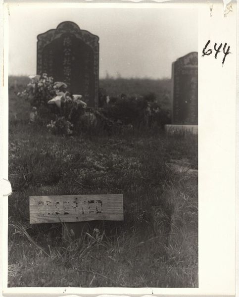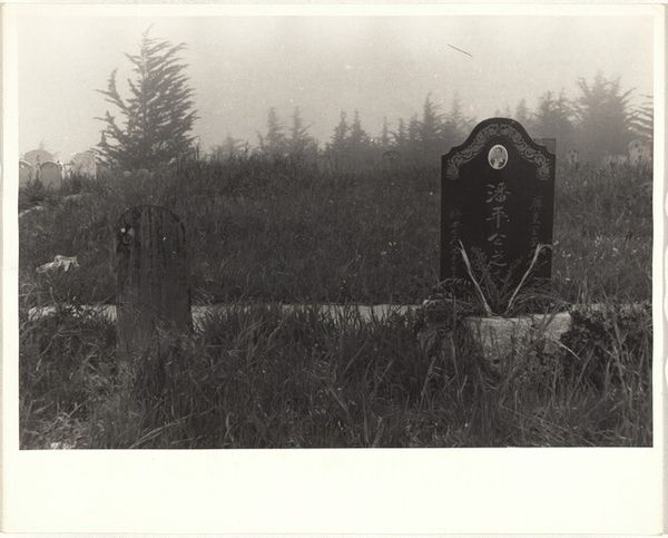 Editor: This gelatin silver print, "Cemetery--San Francisco," was created by Robert Frank in 1956. There's such a somber and still quality to the image, the light feels flat and the grass looks overgrown. What can you tell me about the imagery used here? Curator: The power of this seemingly simple photograph lies in its visual encoding of American anxieties. Consider the symbolism of the cemetery itself – a landscape of remembrance, but also of loss. Notice how Frank doesn't sentimentalize death, he doesn't make it beautiful. He presents it starkly. Editor: What do you mean? Curator: The lack of clear focal point draws the eye everywhere and nowhere. This mirrors a deeper cultural questioning and a kind of displacement after the war. Then look at the wire cage. Editor: I hadn't noticed that specifically before, the wire enclosure, is that to stop people messing with the graves? Curator: Perhaps, but think symbolically. It is a fragile attempt to contain the inevitable – decay, loss, the unraveling of societal structures. Even the fog suggests ambiguity and concealment. Ask yourself: what does it mean to try and control or cordon off a process that is ultimately beyond human intervention? How can it be relevant today? Editor: So it is speaking to societal concerns, not just death? It makes you think about what else in life we try to control... Curator: Precisely! Frank captured not just a physical place, but a psychological space, a cultural memory of a specific time grappling with change. The quiet power in it resonates. Editor: I didn't expect to get so much from a picture of gravestones, but I can really see those deeper themes in it now! Thanks.