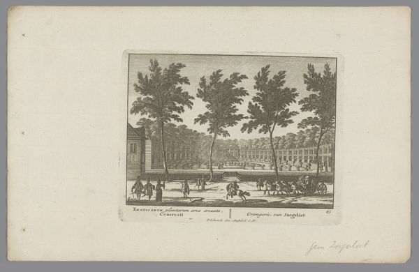 This print, "Gezicht op de Herengracht," was created by Jan van Call in the late 17th century. It's made using engraving, a process where the artist carefully cuts lines into a metal plate. Ink is then applied to the plate and wiped off, leaving ink only in the carved lines. When paper is pressed against the plate, the image transfers, resulting in the print we see here. The quality of the engraving determines the texture and depth of the image. Look closely at the lines defining the buildings, trees, and figures. The fine detail suggests a deliberate and practiced hand. Prints like this played a crucial role in disseminating images and ideas during this period. They were relatively affordable, making art accessible to a broader audience beyond the elite. This print provides a glimpse into Dutch urban life, and the social interactions taking place along the Herengracht canal. Appreciating the labor and skill involved in its production allows us to see it not just as a picture, but as an artifact deeply connected to the social and economic conditions of its time.