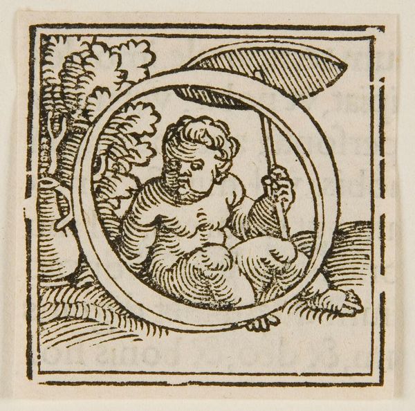 Curator: Here we have an intriguing piece titled "Letter G," by an anonymous artist, housed here at the Harvard Art Museums. Editor: My first impression is one of striking contrast—the delicate detail of the figures against the rough, almost crude, linework of the letterform itself. Curator: The image within the "G" depicts the Virgin and Child, a potent symbol of motherhood and divinity, while the cross held by the child alludes to his future sacrifice. The landscape in the background is a clear visual reference to sacred geography. Editor: Absolutely. The stark black and white and the textured surfaces create a compelling visual rhythm. Look how the artist uses simple lines to suggest volume and depth, almost like a geometric abstraction. Curator: Consider how the initial "G," typically associated with text and the mundane, is transformed into a sacred vessel. The image and letterform together create a powerful symbol pregnant with cultural memory and meaning. Editor: Indeed, it's a fascinating interplay between form and content, leaving us to ponder the relationship between language, image, and the divine.