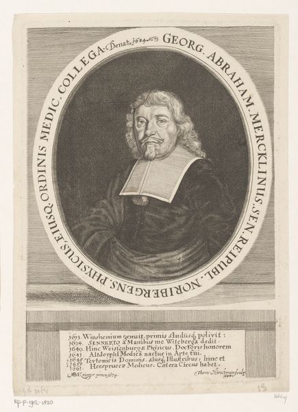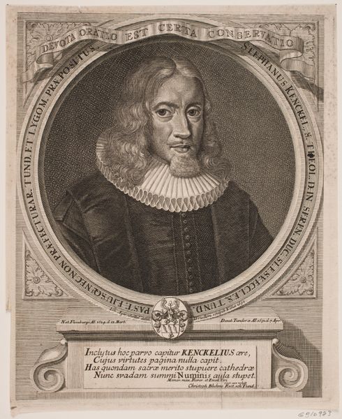 Curator: Here we have a print from 1687 by Marc Anton Gufer, entitled "Portret van Lorenz Häßfurter". It's currently held in the collection of the Rijksmuseum. Editor: It’s a striking image, isn't it? The detail is extraordinary for an engraving. The subject’s gaze is quite direct; I almost feel as if he’s about to speak. There's a sort of stern calmness to it. Curator: Indeed. Gufer demonstrates exceptional control of line, particularly in the rendering of texture. Consider the contrast between the smooth, almost porcelain-like face, versus the intricate lace collar and the feathery quality of the laurel leaves encircling the portrait. These elements, arranged within the formal octagonal frame, establish a hierarchy of visual information that’s very satisfying. Editor: Absolutely, the frame itself is so interesting – an octagon within a square base, adorned with the laurel wreath— symbols of status, learning and victory; a celebration of the subject's virtues. Looking at his attire, the somber palette, further conveys the seriousness of his position in life. Who was he, anyway? The inscription beneath is in Latin. Curator: Lorenz Häßfurter, according to the inscription, was a nobleman and official serving in Brandenburg. He worked as secretary, dealing with the affairs of marriage. This text lends an anchor and clear message from which the forms can draw greater clarity in understanding their composition and value. Editor: That’s interesting context, especially given the rather severe expression. Marriage and nobility… perhaps he oversaw some rather contentious unions! And the laurel, combined with that stern gaze, gives an aura of authority and lasting achievement. There's this idea that his likeness, captured in this print, becomes a symbol that outlives the man, immortalized through visual language and symbolism. Curator: Yes, there is a palpable weight conferred on the depicted by alluding to timeless, lasting cultural associations – an effect reinforced by the graphic starkness that can emerge from the printmaking process. It solidifies Häßfurter into something tangible. Editor: Ultimately, I find myself captivated by the details, not just as masterful renderings but as subtle conveyors of cultural memory. Curator: And I am impressed, always, by how simple lines become structure.