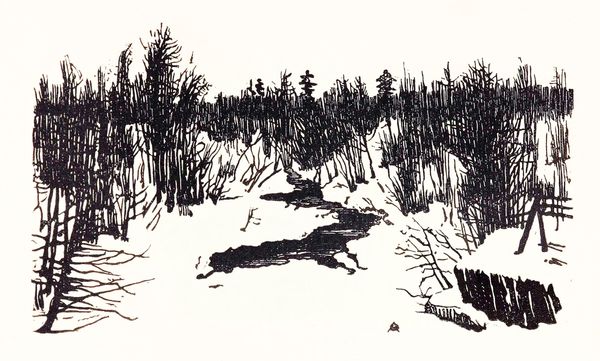 Editor: This is Denman Waldo Ross’s "Landscape with Figures," at the Harvard Art Museums. It feels like a quick sketch, all charcoal and energy. What strikes you most about its composition? Curator: The dominance of vertical and diagonal strokes creates a dynamic tension. Notice how the artist uses hatching to define form and shadow, yet the overall image retains a sense of flatness. Editor: Flatness? Even with the implied depth of the trees and figures? Curator: Precisely. The linear quality overrides any illusionistic depth, emphasizing the two-dimensionality of the picture plane. The artist seems primarily interested in mark-making and surface texture. Editor: So, less about what is depicted and more about how it's depicted? I hadn't considered that. Curator: Exactly. Focusing on the formal elements allows a deeper understanding of artistic intent.