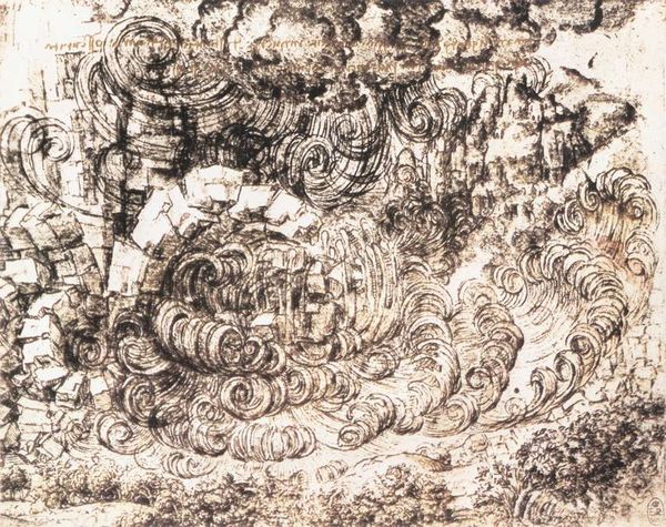 Leonardo da Vinci made this pen and ink drawing, Deluge over a City, sometime around 1517-18. The image seems to depict a catastrophic flood engulfing a city, perhaps reflecting anxieties about the natural world and human vulnerability that were prevalent in Renaissance Italy. Da Vinci, who served as court artist for the ruling Sforza family in Milan, often incorporated scientific observations into his art. This drawing might reflect an interest in hydraulics and the destructive power of water, themes that were also explored in his engineering projects. The swirling lines and chaotic composition convey a sense of overwhelming force, perhaps offering a critique of human hubris in the face of nature's power. By looking into period scientific treatises and the patronage networks that supported Leonardo, we can gain insight into how intellectual, political, and economic factors shaped the production of this remarkable image. Art history is key to understanding art as contingent on these social and institutional contexts.