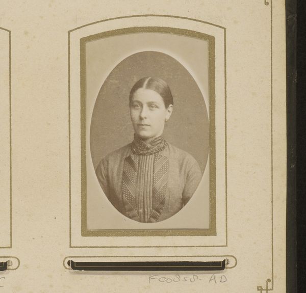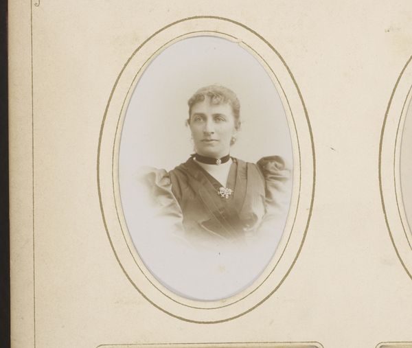 Curator: Here we have a work titled "Portret van een vrouw met halssieraad," which translates to "Portrait of a Woman with Necklace." It is an albumen print created sometime between 1893 and 1915 by Camillus Franciscus van der Aa. It's quite a lovely example of early photography. Editor: It’s striking how intimate and still it feels. Even though it is over a century old, the woman seems quite present. There is an interesting tension in her expression; direct, but somewhat guarded. The subdued tones add a kind of dreamlike aura to her image, almost blurring time. Curator: Albumen prints, popular during that period, gave photographers the ability to produce highly detailed images on paper from glass negatives. These prints provided a standardized way of creating and distributing portraits, affecting social norms by placing a visual emphasis on bourgeois society. Editor: You know, considering that photography was then relatively new, one can't ignore how powerfully portraits, such as these, have influenced our perception of people’s individual and collective identities across history. Her necklace draws attention to the rigidity of her collar; she appears to be restrained, like she cannot remove it. This highlights expectations regarding how women should adorn and present themselves. Curator: Exactly. It also speaks volumes about the social expectations and constructed gender roles. In a world without selfies, painted or photographic portraits played an even more central role in the construction of a personal and familial narrative. Editor: You're right, of course. Beyond aesthetics, it embodies a complex socio-cultural phenomenon. It provokes me to think about visibility, agency, and representation back then. Curator: Considering it, a modern audience is forced to grapple with the differences and continuities between our era of constant visual stimuli, and a society where photographs like this were far less commonplace, imbuing the simple portrait with power. Editor: It feels like a gateway, not just to the past, but to ongoing dialogues about how we perceive, categorize, and assign value. I feel connected with the woman and wonder about her experiences in society. Curator: It's a testament to the power of images, isn't it?