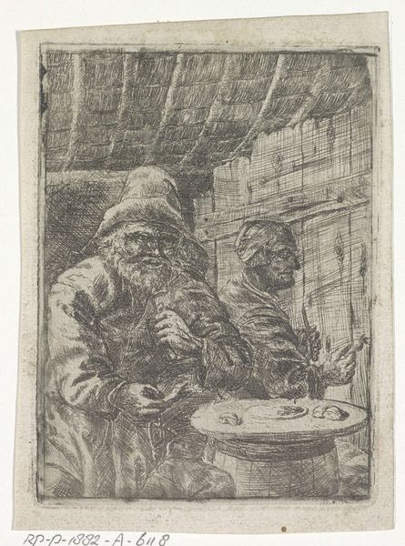 Curator: Ah, this engraving pulls you in, doesn't it? It's titled "A Lyre Player and a Violin Player," dating sometime between 1723 and 1789, and we attribute it to Jacob Hoolaart. Editor: Immediately, I'm struck by the… awkward charm, I suppose. It's like a beautifully rendered caricature, full of curious energy. The figures seem caught between mischief and melancholy. Curator: Indeed! These wandering musicians represent a popular theme within genre painting of the era. We often see the pairing of an adult performer and a younger accompanist, representing the passing down of traditions, and even, perhaps, different social classes united by music. Editor: Interesting, and is that child… a musical prodigy? I’m kidding, kind of. He seems so earnest, his brow furrowed as he plays the violin, in contrast to the slightly disreputable elder with the lyre, sporting that amazing hat. It's an interesting contrast, isn’t it? Innocence alongside… experience, let's say? Curator: The choice of instruments speaks volumes. The lyre evokes antiquity, a refined past. The violin, emerging in popularity, signals a more immediate, perhaps less structured form of musical expression, though the social context could easily associate both to travelling folk culture. Editor: And look how the engraver uses light! It’s so dramatic, isn't it? Pooling around the faces, almost theatrical. Are those etched lines deliberate, or is this a study of chance encounters? I think that it tells a lot about that time that there is music in the streets to animate it. It certainly moves me! Curator: A question for all eras, really. Are our traditions a rigid structure, or an invitation for something more dynamic and open? Jacob Hoolaart makes one reflect. Editor: He does, he really does. And, wow, what a band. I kind of wish I could hear what they sounded like. Makes you think what kind of art the future might hold and think about you too.