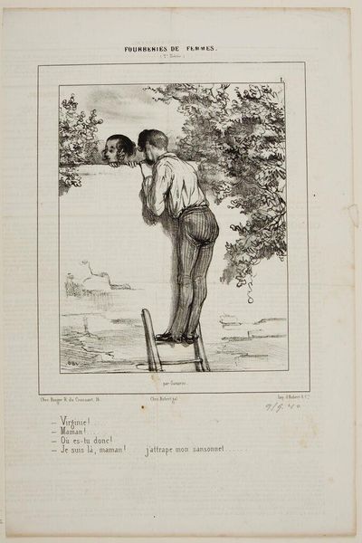 Curator: Honoré Daumier's lithograph, "A Difficult Navigation," now residing at the Harvard Art Museums, depicts two men seemingly struggling to pull a boat. Editor: My first thought? It's a delicious slice of everyday frustration. The line work is so energetic, you can almost feel their weariness, the weight of the task. Curator: Indeed! Daumier often used his art to satirize the bourgeoisie, so one might interpret this scene as a commentary on their aspirations and the often-laborious reality beneath the surface. Editor: Perhaps that's it. The physical labor clashes so starkly with the idea of leisure. It strikes a chord about the realities that underpin the veneer of society. Curator: Daumier’s commentary is timeless. Editor: Absolutely, an astute and relatable observation.