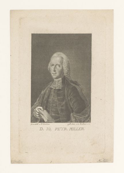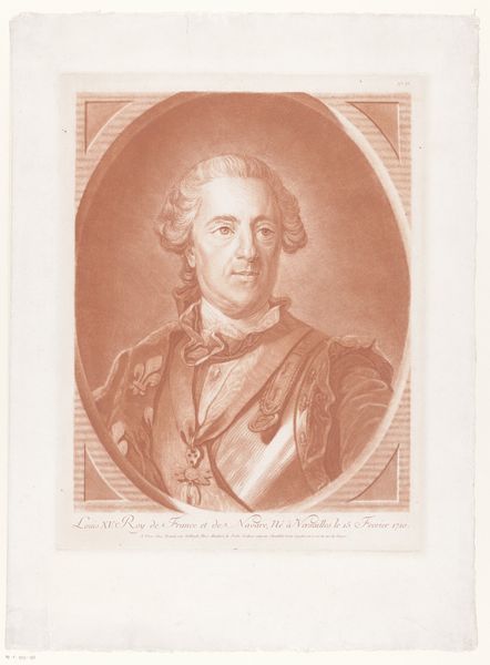 Editor: This is a portrait of Louis Marchand, engraved sometime between 1738 and 1755 by Charles Dupuis. It's a beautifully rendered print; I’m struck by the formality of the subject. What social dynamics do you think are at play here? Curator: The engraving is more than just a likeness; it's a carefully constructed representation of power and status in 18th-century France. Dupuis, through his skillful engraving, is participating in the visual language of the French court. Look at how the Baroque style frames Marchand—do you notice the carefully chosen details contributing to this message? Editor: I see that framing; it’s very deliberate. The inscription below identifying Marchand as "Organiste du Roy"—Organist of the King—must signal his official position, and likely his social standing. But why create a print? Who was this image intended for? Curator: Precisely. Prints like this were often commissioned to circulate among the elite. Think of it as an early form of public relations, reinforcing Marchand’s importance but also the cultural significance of the court. These images helped create and maintain social hierarchies. The "Organiste du Roy" served both a musical and representational function for the monarchy, and the print broadcasts it all. How do you see the visual elements like his clothing reflecting those concepts? Editor: That’s fascinating. I guess I had thought of portraits as being quite personal, but this feels much more like a carefully managed message about power and prestige. I notice how much the lace and decoration contrasts against a sort of cold distant expression on his face. Curator: Yes! These works operate as social artifacts just as much as they function as artwork. Now that you know some of this context, does it shift how you view the piece? Editor: Definitely. I now see this engraving as a snapshot of a specific time and place, revealing how art played a vital role in shaping perceptions and reinforcing the social order of the French court.