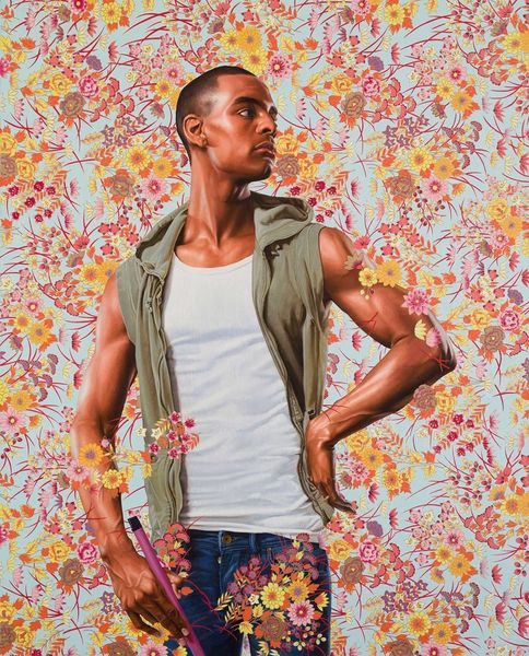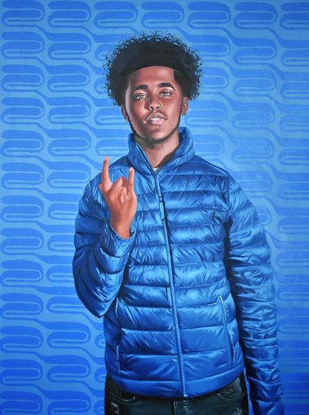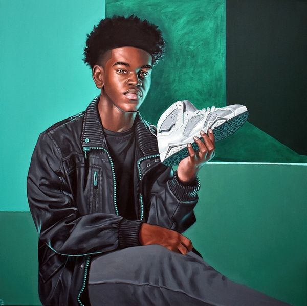 Curator: "Petty Pink," a striking oil on canvas created by Monica Ikegwu in 2018, presents a compelling portrait in monochrome shades of pink. Editor: Woah, pink overload! I mean, the guy's dripping in it from head to toe, against that rose-tinted background. Talk about commitment to a color! It's a bit… unexpected, isn't it? Curator: The deliberate choice to saturate the canvas with a single hue emphasizes the painting’s structural elements—the interplay of light and shadow defining the subject’s features, and the geometric lines formed by his clothing. Consider how Ikegwu is manipulating the subtle gradations within this pink spectrum to create depth. Editor: True, there's more going on than just "pink, pink, pink!" The way the light catches the bomber jacket, for instance—it's almost luminous. And I'm noticing this sly Louis Vuitton belt. This pop suggests that beyond the pink on pink is this current culture aesthetic or value statement being put forward. Does that land right with you? Curator: I think so. Semiotically, the repetitive use of pink coupled with designer details is striking and potentially challenging the expected signifiers of masculinity. Editor: And it kinda works! There’s a coolness to it despite all the…pink. The painting feels confident, not bashful at all. A reclaiming, maybe? Curator: Exactly! And I find the gaze he’s directing back at the viewer intensely introspective despite the initial statement created by the color. I would love to understand the interaction Monica had with her sitter here. Editor: Maybe it's that kind of tension, then, that makes "Petty Pink" so memorable: between expectation and delivery, between simplicity and depth, between the monochrome and the…Louis Vuitton. A pretty interesting subversion when you think about it.