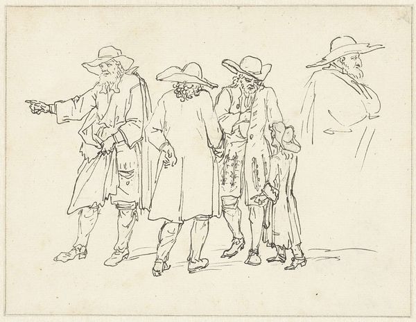 Wilhelm Marstrand created this delicate drawing, "Group of Four Swedish Peasants," using pen and brown ink on paper. The composition leads the eye across the four figures, each delineated with brisk, economical lines. Notice how Marstrand uses line weight to suggest depth, with bolder strokes defining the foreground figures. There's a sense of understated observation, evident in the way the artist captures the textures of their garments. Marstrand masterfully conveys form and character, using the linear quality of the medium. The subtle use of hatching adds volume and shadow, while the negative space around the figures gives them room to breathe. The structure of the artwork invites a close inspection of each figure's pose and expression, creating a silent dialogue between the viewer and the viewed. Marstrand's study functions not just as an aesthetic record but also as a cultural document, offering us a glimpse into a specific time, place, and social stratum. Note how the choice of medium reinforces this sense of immediacy, the sketch-like quality underscoring the artwork’s role as a visual note.