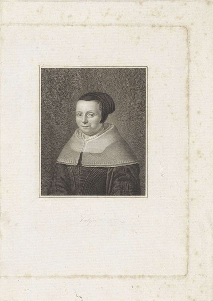 Curator: What a serene expression! I feel drawn in immediately by the quiet dignity. Editor: Indeed. What we have here is an engraving, now held at the Rijksmuseum. It is entitled "Vrouwenportret. Buste in ovaal, een weinig links gewend, met zwart kapje op, een grooten linnen met kant omzoomden kraag om, en met hangers in de ooren," and was created sometime between 1615 and 1676 by Theodor Matham. Quite a title, isn't it? So descriptive! Curator: Absolutely! And Matham really captures the spirit of the Baroque era with its love for detail, especially in that glorious lace collar. The way he renders texture in simple lines is astonishing! It has this beautiful oval frame which I see as the symbolic egg – a powerful archetypal image. Maybe hinting at fertility, family, heritage? What are your thoughts about it? Editor: Hmm, I initially found the composition somewhat...constrained. But the more I look, the more I appreciate her steady gaze – that hint of inner strength amidst all the rigid societal expectations encoded in her attire. What would it have been like for the sitter to engage with Matham, and eventually to see her portrait memorialized in such a permanent manner, is anyone's guess. There is some story hidden somewhere. Curator: Precisely! This portrait provides a looking glass, an image through which we may project questions about female roles during the Dutch Golden Age. How did the rising merchant class impact traditional portraiture? And how did gender shape those very portrayals, subtly or not so subtly, informing our collective memory. This print certainly is very insightful. Editor: It certainly prompts a great many questions about those bygone eras. Makes you think, doesn’t it? Now, back to our time! Shall we proceed?