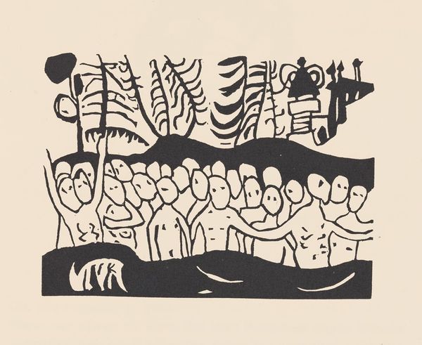Curator: This is a plate from "The Dreaming Youths," a lithograph possibly created by Oskar Kokoschka between 1907 and 1917. It resides now at the Minneapolis Institute of Art. I find it so fascinating; what's your first take? Editor: My goodness, it’s like a slightly unsettling children’s book illustration. The colors are bright, almost aggressively cheerful, but the scene itself feels… off. What’s with the floating fish? Curator: I see what you mean! The visual language seems rather bold for its time. Kokoschka was, after all, a leading figure in Expressionism, which sought to convey intense emotional experience. There’s an interesting dissonance with the seeming lightheartedness. Look at the solid, bright fields of color made through the lithographic printing process. Editor: Right, and you've got this very direct, almost primitive, quality in the way he’s depicted the figures. Their forms are simplified, but it seems more like an intentional distancing effect. Lithography at this time opened many avenues for social commentary and accessible dissemination, particularly since printmaking was deemed a 'lesser' art in academic circles. Do you think Kokoschka's piece deliberately addresses this perceived value hierarchy? Curator: I love that reading! I suspect Kokoschka found lithography quite liberating. The medium allowed him to push boundaries, merging high art ideals with what was considered craft. You can almost feel a subversive humor, like he's winking at the establishment while exploring the darker recesses of youthful anxieties and desires, not only that, the artist incorporated German poetry into the print. I find it gives an extra eerie feel to it. Editor: Yes, absolutely. This really encourages me to consider this in context to a broader network of artists using affordable materials and challenging conventions. It really does change the way we consider traditional methods of art production, doesn't it? Well, this has given me a whole new framework with which to consider the social value and democratization of printmaking. Curator: Indeed! And for me, it reiterates how powerful seemingly simple images can be in conveying deeply complex emotional and societal reflections.