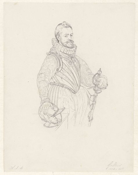 Editor: Here we have Charles Turner’s engraving, “Portret van Willem I, prins van Oranje,” created around 1814. The detail is really striking for a print. What’s your read on this work? Curator: Observe the linearity employed. It establishes not only the contours of the figure but also its mass and volume. The delicate cross-hatching builds depth, yet the emphasis remains on line as the primary formal element. Consider also the composition: The subject’s stance, the angle of the sword, and the draped fabric all create a dynamic interplay. Editor: Yes, the cross-hatching does create a certain depth. So, is it primarily about the relationship between lines and form? Curator: Precisely. How the artist manipulates line to generate texture, define space, and delineate form constitutes the essence of this piece. It moves beyond mere representation, becoming an exercise in the capabilities of the engraving medium itself. Note also how light and shadow are rendered purely through the density and direction of these lines. Editor: I see what you mean. It's almost like he's showing off what the engraving technique can do. Would you consider the space behind the subject, defined only by a sketched column, to add or detract? Curator: The ambiguity of the setting prompts us to concentrate further on the figure and his attire, creating another relationship. How would you say that contributes to its effectiveness as an object for the eye? Editor: Thinking about the print's technical accomplishment and the visual composition really gives me a new appreciation for the image. Thanks. Curator: Indeed. It is through this analytical scrutiny that we uncover the aesthetic logic driving the creation of art.