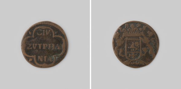 Curator: Here we have a Gelderse duit from 1633. It offers a glimpse into the visual and material culture of the Dutch Republic. Editor: My first impression is its stark materiality. The roughness of the metal and its clear signs of wear tell of a practical object that passed through many hands, bearing witness to everyday economic exchanges. Curator: Precisely. Notice the careful arrangement of inscriptions and heraldic symbols. The central monogram, surrounded by stylized foliage, projects an air of authority and stability. Its compact geometry ensures that it would be recognized even when worn. Editor: The foliage around the script gives it this halo effect, linking the ruler to more holy icons, or elevating the coin from a monetary tool to something carrying deeper national pride. Also interesting is how the wear gives the impression of age beyond its years. Curator: The very specific font used holds importance too. We can look at its influence of Baroque forms. It marks an engagement with artistic trends which speak of the period's aesthetics, expressing this official design language through a standardized metal casting process. Editor: The act of standardization feels very modern now, doesn't it? I wonder what it felt like then...this declaration of value through form and weight, something physical but representative. Curator: We might see the metal and engraving, coupled with design layout, as evidence of proto-industrial production methods starting to transform European society at the time. It’s a physical artifact of social standardization, slowly creeping through daily life! Editor: Considering the context, tracing how symbols become interwoven with identity gives us new angles on how individuals saw their place in Gelderland back then. A little coin carries immense layers of historical meaning. Curator: It offers quite the formal encapsulation, a compressed sign system intended to solidify meaning and communicate ideas of rulership! Editor: Indeed! Delving into what these symbols meant, and understanding its structure of composition offers so many compelling entry points for looking into cultural meanings, of then, and of now.