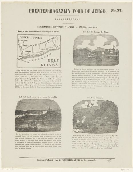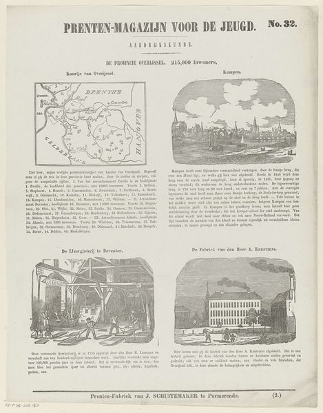 Curator: This engraving, dating back to 1850, is entitled "Europisch Turkije - 10,000,000 inwoners" created by Jan Schuitemaker. It combines cartography with various illustrative scenes, all presented with explanatory text. Editor: The immediate impression is of something functional yet also visually intriguing. The aged paper and the precision of the engraving technique evoke a sense of history, almost like looking at an early prototype of a modern infographic. Curator: Precisely. Consider the means of its production: engraving, printing, and the distribution intended for educational purposes. We are examining the confluence of artisanal craft, technological innovation, and the commodification of knowledge through print. Editor: Let's contextualize this within mid-19th century Europe. The artwork points to a specific fascination with, and perhaps even a veiled political stance on, the Ottoman Empire—or "Europisch Turkije". The visualization of the population size alongside geographic details situates people within a larger social framework. Curator: Indeed, Schuitemaker's focus extends to representing materials like paper and ink. What was the original stock? Was it locally sourced near his factory, or did it depend on global trade networks? These details mattered economically and impacted the overall accessibility of printed matter to a wider audience. Editor: Absolutely. The map itself is a loaded signifier. Boundaries are being defined, spaces are claimed visually. The focus on '10,000,000 inhabitants' speaks to empire, resources, and demographic control as significant components of the region's characterization. Who gets counted and who is erased from this picture? What biases are present? Curator: Also note the integration of image and text. This challenges traditional hierarchies of "high" art and craft. Typography becomes part of the overall aesthetic and narrative structure. How did this blend impact the dissemination and understanding of the represented information at the time? Editor: Considering today's political discourse around immigration, nationalism, and contested territories, works like this hold up a mirror. They remind us that these anxieties and power dynamics have deep roots and continue to evolve across generations and continents. Curator: By studying its materiality and production, we gain insight into how this printed image once functioned within its society. The methods, skill and access of this "Presten-Fabriek" allowed them to play a unique role. Editor: Agreed, its place within contemporary debates allows for a rich, interdisciplinary investigation bridging art, geography, history, and critical social theory.
