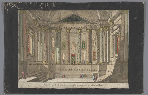 Editor: So, here we have "Gezicht op het interieur van een Romeins bouwwerk," or "View of the Interior of a Roman Building," created sometime between 1745 and 1775 by Jean-François Daumont. It seems to be a watercolor print. I'm really struck by the colors; that muted, almost faded palette gives it such an aged and timeless feel. What’s your perspective on this? Curator: Let’s consider the materiality. It’s described as an ink print, but what kind of ink? Was it a readily available, cheap ink, or one painstakingly produced with particular pigments? Think about how that choice influences the image. Also, this isn't just any paper; it's been identified as homemade. Editor: How does that influence your understanding of it? Curator: Well, consider the labour involved in creating both the paper and the print itself. This isn't mass-produced; it’s the product of someone’s dedicated time and skill. How accessible would such a print have been? Who was the intended audience, and what were they meant to consume with this image? Are we really seeing "Rome" or a romanticized European interpretation *of* Rome, and, ultimately, of power itself? Editor: So, it's not just about the grand Roman architecture, but about understanding the conditions that allowed for its depiction and the statement it made. That really changes how I look at it. Thanks! Curator: Precisely! We must look at both image and manufacture, both subject and subject's subjugation to those processes of making. It shifts how we consider the artwork.