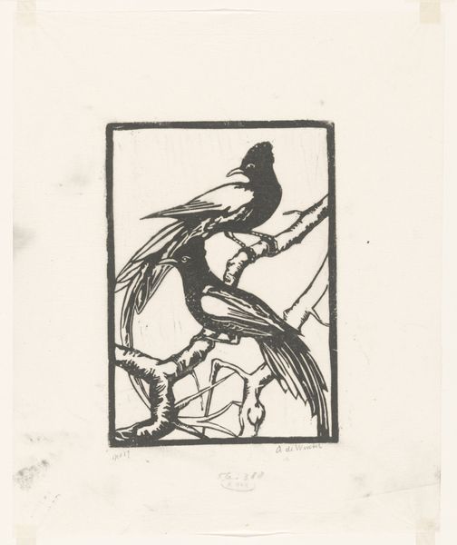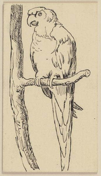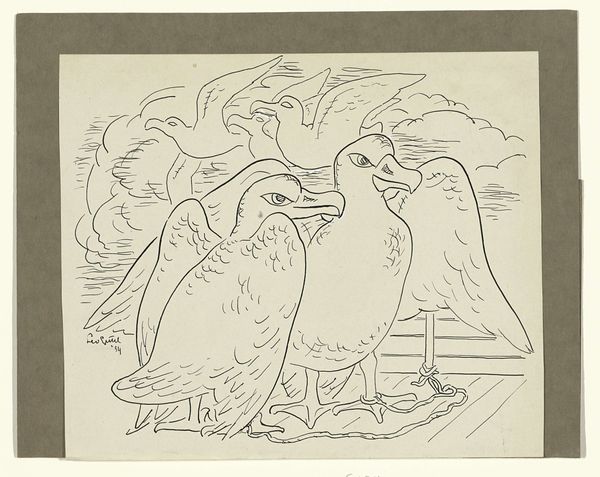 Curator: Let's turn our attention to "Two Eagles," an ink drawing crafted in 1958 by Rudy Pozzatti. What strikes you upon first glance? Editor: They feel so... present. Perched and alert, yet there’s this beautifully awkward vulnerability in their posture, in those spindly little legs. It's a striking combination. Curator: The eagle, as a symbol, carries tremendous weight – power, freedom, even divinity across various cultures. Yet here, rendered with such delicate lines, almost a childlike simplicity, Pozzatti seems to be deliberately stripping away some of that symbolic baggage. What remains is…raw birdness. Editor: Precisely! It’s like witnessing a heraldic emblem letting its guard down. Look at how freely he uses the ink, letting the line waver and almost stumble at times. He isn't chasing a photorealistic likeness but capturing the fleeting essence of movement, perhaps even a hint of personality. There's an inherent abstraction. Curator: Observe, too, how Pozzatti positions the eagles—one above the other, facing in slightly different directions. It evokes a sense of duality or reflection, hinting at multiple perspectives. Are these two aspects of a single idea? Or two separate entities engaged in silent discourse? The positioning alone suggests relationship and comparison, but also contrast. Editor: Oh, I love that—"silent discourse." I also see a hint of humor in those somewhat bewildered expressions. Maybe they're pondering their iconic status, their place in art history, those heavy symbolic chains they've carried for centuries! Curator: It is fascinating how a medium as seemingly straightforward as pen and ink can be used to dismantle, question, and ultimately reimagine established symbols. It highlights the enduring power of simple artistic interventions. Editor: Definitely. This drawing feels like an invitation to liberate our own perception—to shed preconceived notions and just appreciate the quivering line, the awkward stance, and the undeniable character of these “Two Eagles”. A friendly nudge to look beyond the icon. Curator: Indeed, Pozzatti encourages us to reassess inherited narratives and look with fresh eyes. Thank you for that perspective. Editor: Thanks to you, always a joy to unlock new insights.