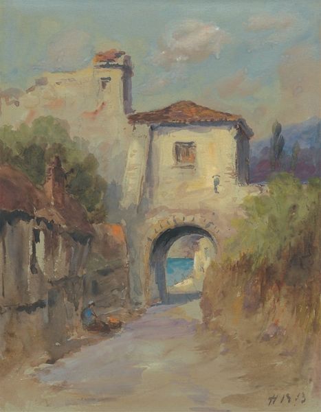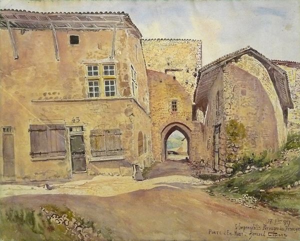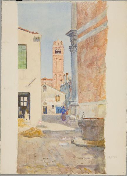 Editor: This is Dodge Macknight's watercolor, "Probably Fontvielle," at the Harvard Art Museums. The light in this painting is amazing, it makes me feel like I'm standing in the warm sun. What do you make of it? Curator: The shadows hold as much weight as the structures themselves, don't they? They suggest a history, a cultural memory embedded in the stones and tiles. Do you see how the artist uses color to evoke a sense of place, of time worn down and rebuilt? Editor: Definitely. The colors give it a sense of age. It almost feels like I've been there before. Curator: It’s that resonance, that feeling of familiarity, that makes symbols so powerful. I see the sun-drenched buildings as more than just architecture. For me, they embody perseverance, endurance. Editor: I never thought of it like that, but I see what you mean! Thanks for sharing your insight.