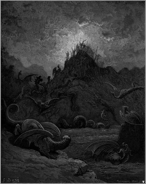 Editor: This engraving, "The Inferno, Canto 30" by Gustave Doré, depicts a chaotic scene with figures and snakes rendered in great detail using ink. It feels very intense and disturbing. What do you see in this piece? Curator: This work offers us a potent visual representation of Dante's Inferno, reflecting a 19th-century obsession with the darker aspects of human nature. I am struck by Doré’s exploration of punishment and transformation. Consider how the monstrous figures and entwined bodies could be read through a Foucauldian lens, representing societal power structures at play, punishing transgression and shaping identity. Editor: So, you see the image relating to how societal power is applied in that era? Curator: Precisely. Romanticism, which defined the era of Doré, often embraced subjects that questioned Enlightenment ideals of progress and reason. This piece embodies that perfectly. Do you think Doré offers any glimpse of hope, of possible resistance, or is it simply a bleak panorama of societal and personal doom? Editor: It's hard to see any hope here, just writhing bodies and snakes. The overwhelming sense is definitely doom. It also seems as if they have transformed into monsters themselves. Curator: Yes, and it's interesting to consider what "monstrous" means in a context where society itself might be considered monstrous. Editor: That's a perspective I hadn't considered. I'm starting to appreciate the historical and theoretical lenses through which art can be interpreted. Thanks. Curator: Indeed, it invites us to question our contemporary society, which may be as wild and terrible as Doré's engraving!